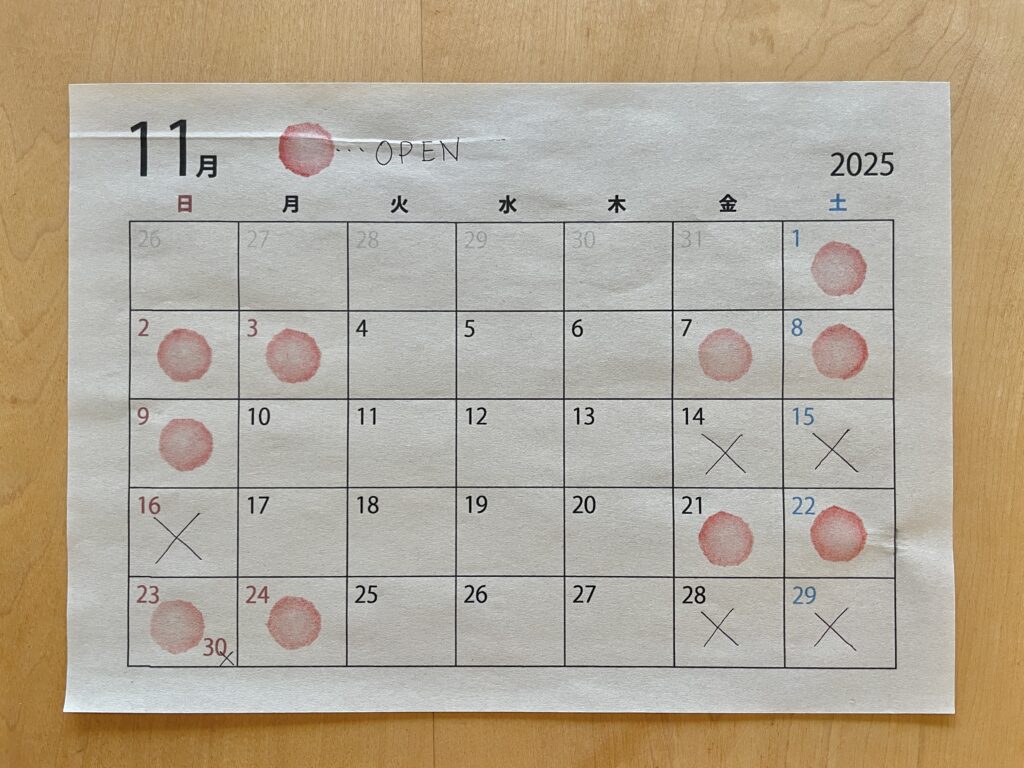 11月は木担当の福岡出展があり、お休みが多くなっておりますので宜しくお願い致します。