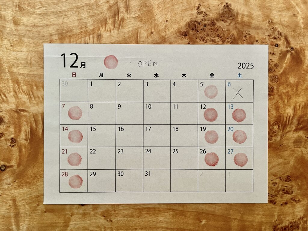 早いもので今年も最後のひと月となりました。6日の土曜日はお休みをいただきます。何かと気忙しい12月ですが張り切ってお待ちしております!
